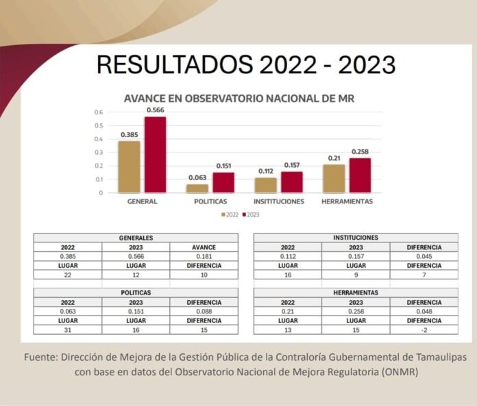 Ciudad Victoria, Tamaulipas.- La contralora gubernamental, Norma Angélica Pedraza Melo, anunció que Tamaulipas avanza en el indicador de la Estrategia Nacional de Mejora Regulatoria 2023. Lo anterior con base en el informe del Observatorio Nacional publicado en abril, que con base en la metodología de tres pilares que integran políticas, instituciones y herramientas, se determina a Tamaulipas como la entidad con más puestos avanzados en esta área, ya que en 2022 se encontraba en el lugar 22 y actualmente se sitúa a la entidad en el lugar número 12, lo que refleja un avance positivo de 10 posiciones.