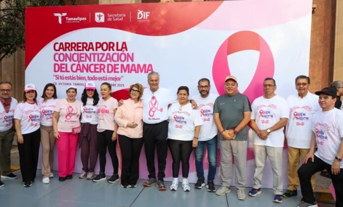 Como parte de las actividades para conmemorar el Día Internacional de Lucha contra el Cáncer de Mama y acompañado de la líder de la burocracia estatal, Blanca Valles Rodríguez; de la presidenta del Supremo Tribunal de Justicia, Tania Contreras López; y de su esposa la señora Yolanda Rivera de Hernández, el titular de Salud llevó a cabo la carrera de concientización y sensibilización de este padecimiento, así como incrementar la responsabilidad de mujeres, hombres y población en general en la prevención y detección temprana del cáncer de mama.